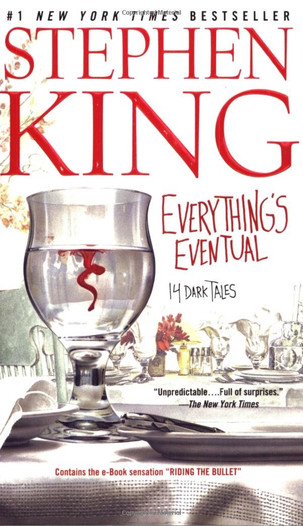 "Everything's Eventual" is a collection of 14 short stories by Stephen King, first published in 2002. The stories in this book span a wide range of genres, including horror, science fiction, and fantasy.